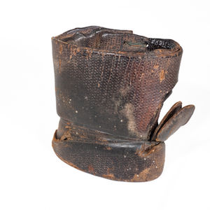 The mitten was made of hardened leather fastened together with metal loops. It was a simple cylinder open at both ends with a cut out to place thumb through. The cut out has a flap to protect the thumb and the
