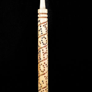 This bobbin design was introduced by Flemish and Huguenot lace makers, who fled persecution in the Low Countries and France in the mid 1500’s. Many settled in Buckinghamshire and Northamptonshire, where their skills were passed on to the local women. The area became an important lace making centre. The bobbins are made from turned wood, the large end acting as a weight to hold the lace thread taut.