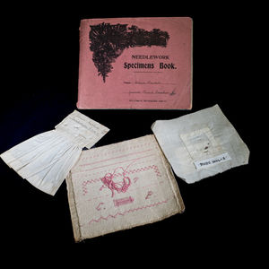 They were sewn as teaching aids by Clair Parlett, who was possibly aged 14 or 15 at the time. The illustration shows a seven page specimen book with eight samples of work. Most of the items were sewn by Clair and include: a gathered cuff with a worked buttonhole in pale blue thread and a covered button; two different techniques for use in an applied calico mending patch, and a paper pattern for a chemise sleeve.